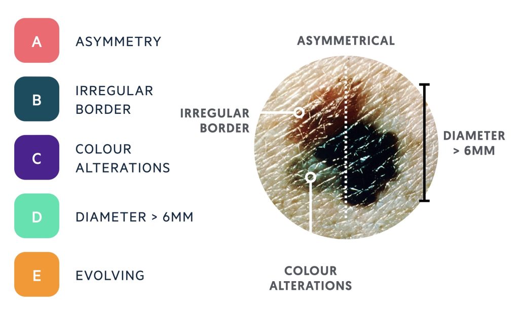 - Follow the ABCDE rule: Asymmetry, Border irregularity, Colour variation, Diameter over 6mm, Evolving appearance.